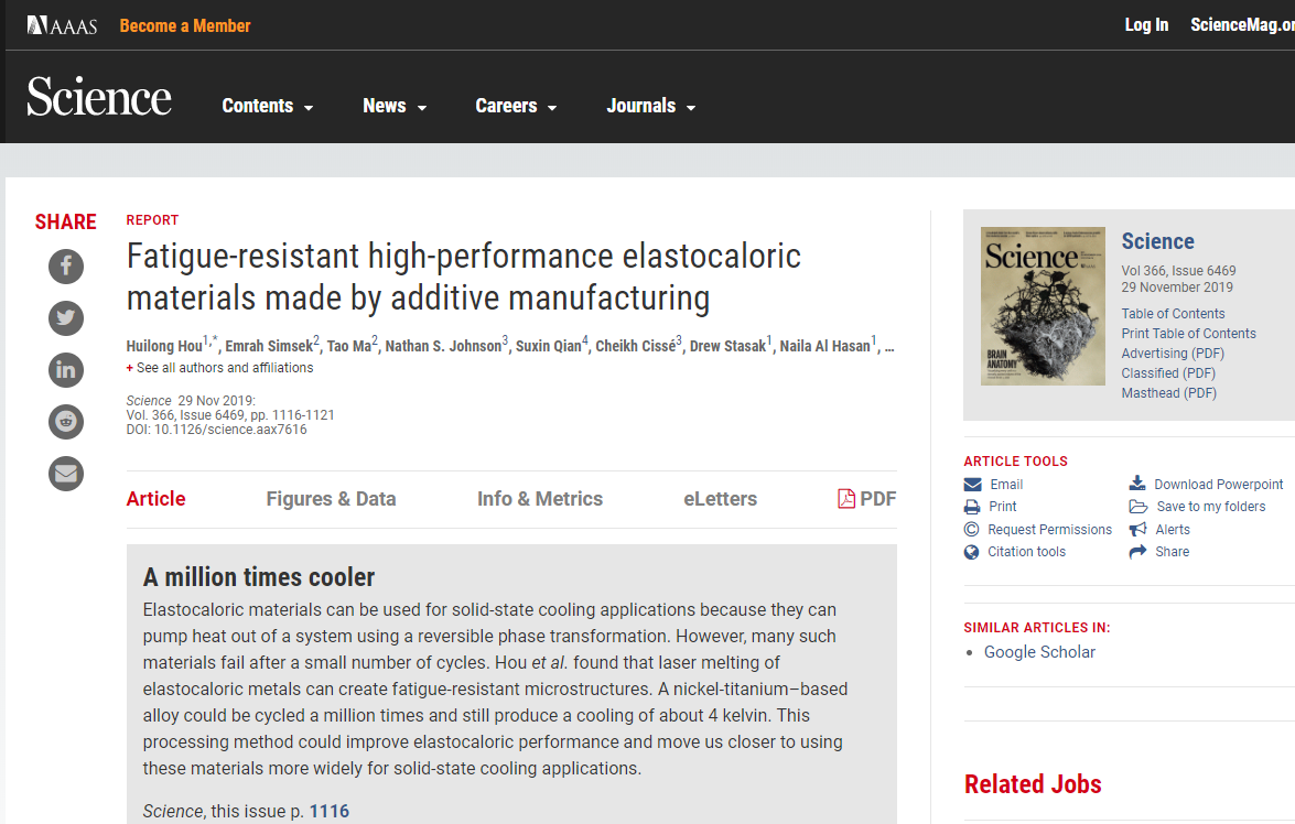 文章信息: Huilong Hou, et al. Fatigue-resistant high-performance elastocaloric materials made by additive manufacturing. Science 366, 1116-1121 (2019).