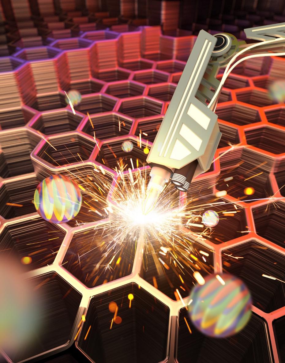 图为增材制造抗疲劳、高性能应力制冷材料的示意图。(右上)粉末送料机用以提供元素粉末并加以混合,形成近共熔成分;激光在聚焦时提供能量;(中间)混合的元素粉末在激光的作用下熔融,形成局部熔池;随着局部熔池的不间断移动,构件的不同部位依次形成;(背景)作为范例展示,蜂窝状构件的形状和高度依次形成。